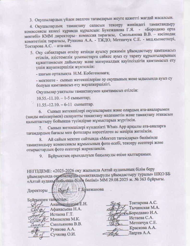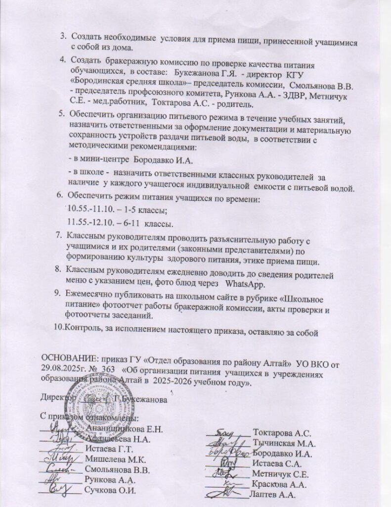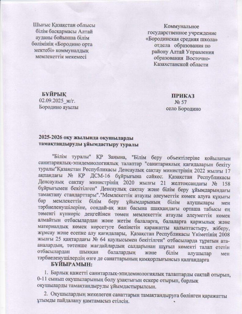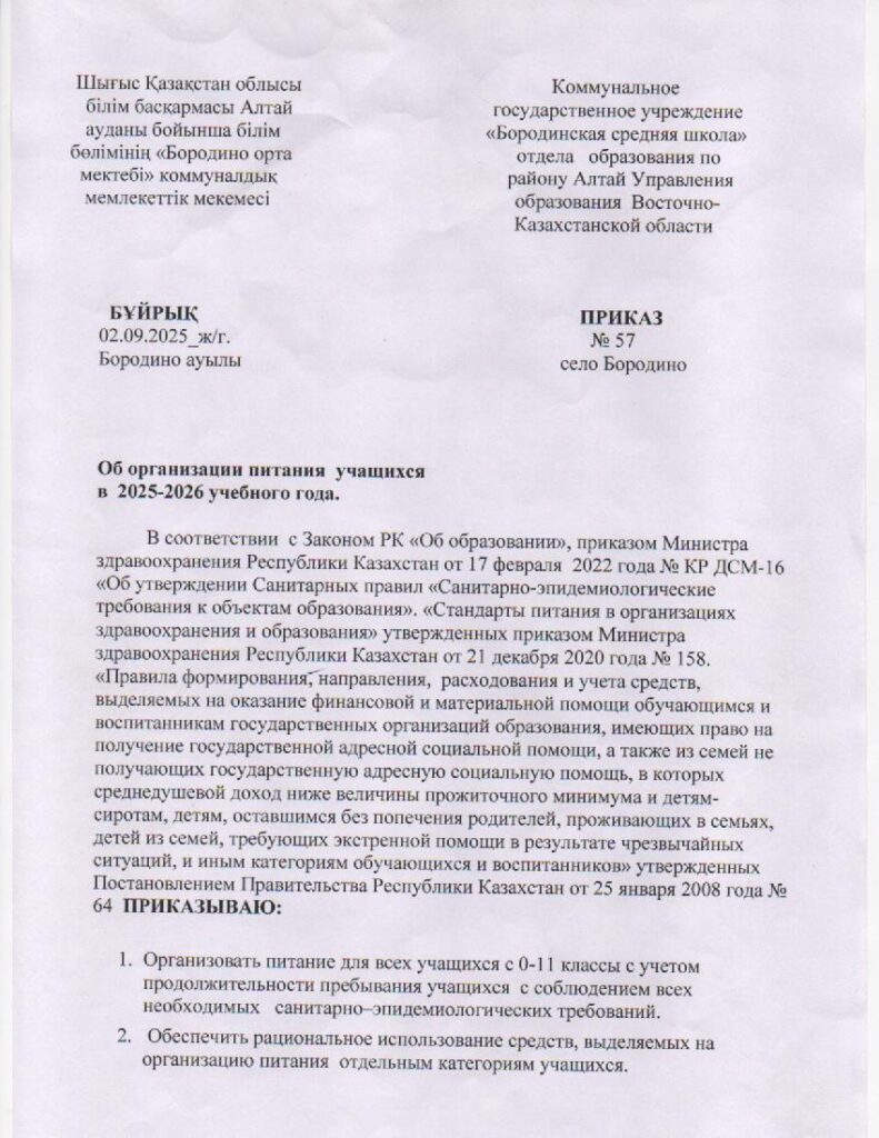2025-2026 оқу жылында оқушыларды тамақтандыруды ұйымдастыру туралы бұйрық. Приказ об организации питания учащихся в 2025-2026 учебном годуОт admin / 03.09.2025