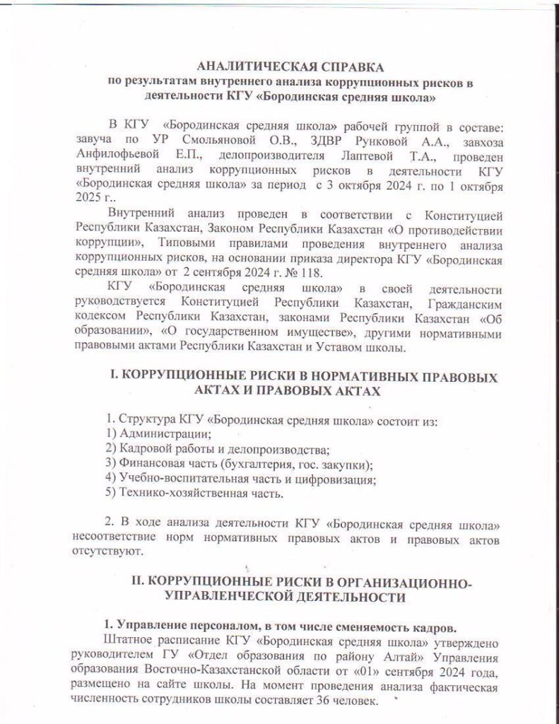 Предыдущая страница ШҚО ББ Алтай ауданы білім беру бөлімінің «Бородинская орта мектебі» коммуналдық мемлекеттік мекемесінің қызметіндегі сыбайлас жемқорлық тәуекелдерін ішкі талдау нәтижелері жөнінде аналитикалық есеп Аналитическая справка по результатам внутреннего анализа коррупционных рисков в деятельности коммунального государственного учреждения «Бородинская средняя школа» отдела образования по району Алтай УО ВКО